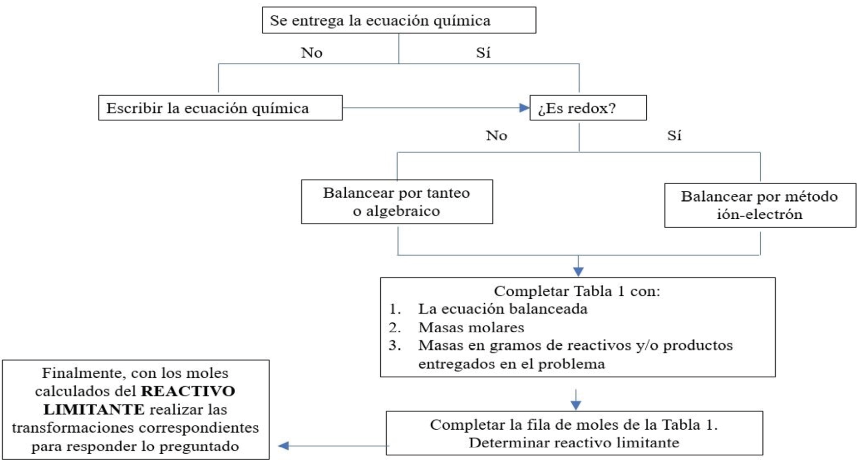 Se aplicó un pretest de 30 minutos con un problema estequiométrico. En esta evaluación, los estudiantes debían resolver el problema únicamente con base en las clases convencionales. Posteriormente, se les presentó el diagrama de flujo (Figura 1) y la tabla (Tabla 1), junto con instrucciones para su uso. Una vez comprendido el funcionamiento de ambos recursos, se aplicó un postest de 30 minutos, en el que debían resolver un nuevo problema utilizando el diagrama de flujo y la tabla, organizando así los datos para desarrollar adecuadamente la resolución.