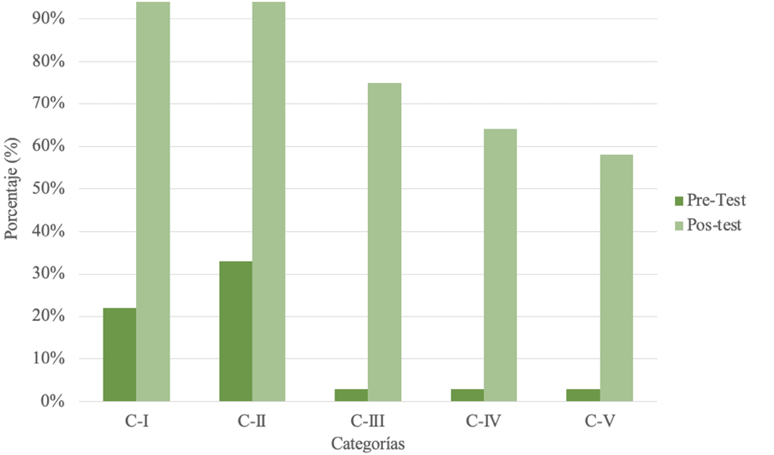 La comparación entre los resultados del pretest y el postest (Figura 2) muestra una mejora significativa en el rendimiento en las cinco categorías.