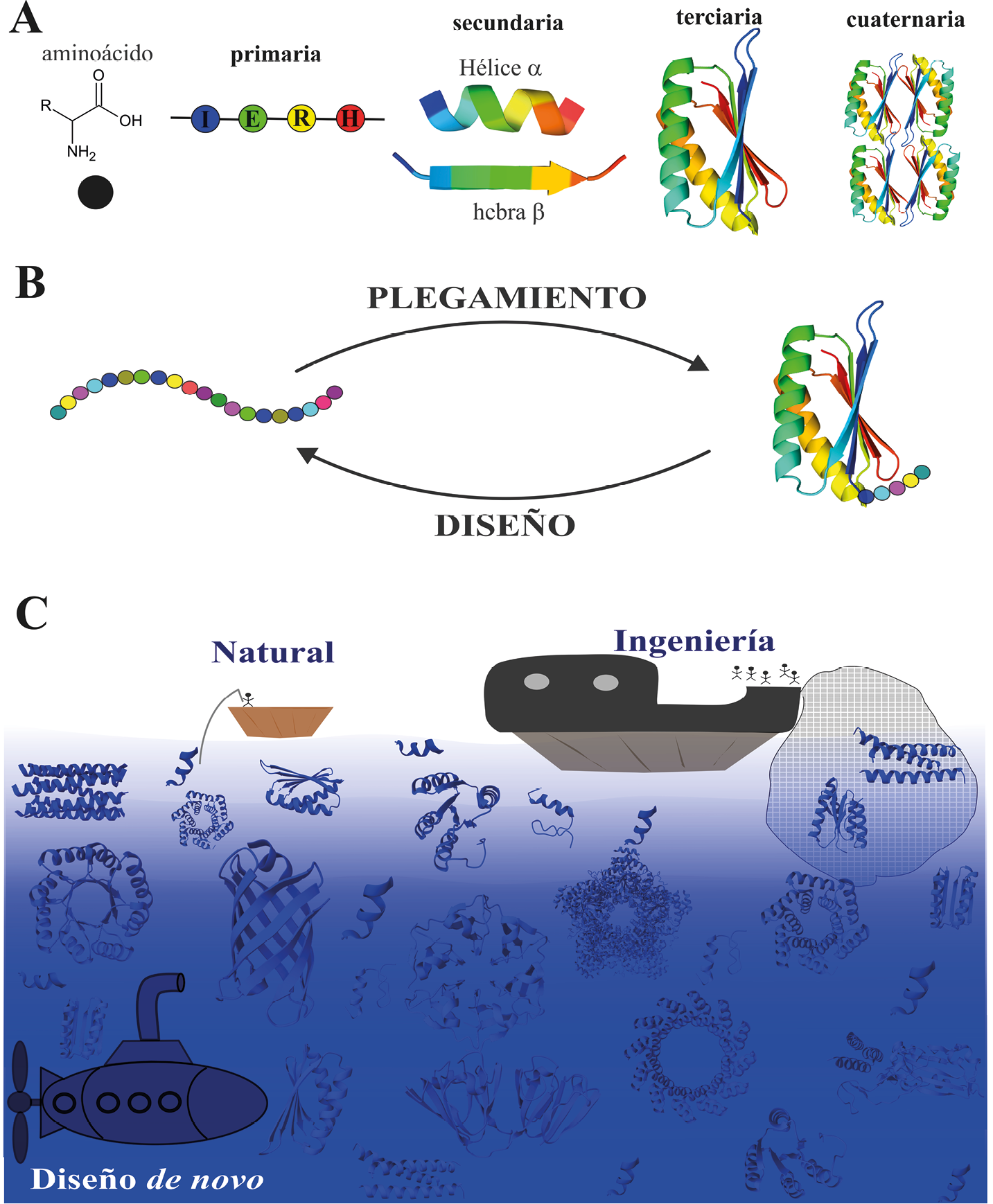 Figura 1. (A) Estructura general de un aminoácido y niveles estructurales de una proteína: primaria, secundaria, terciaria y cuaternaria, donde cada círculo representa un aminoácido. (B) Relación entre el plegamiento y el diseño de proteínas. (C) Espacio de secuencia de proteínas. La naturaleza ha muestreado una pequeña fracción de todo el espacio de secuencia posible; aunque la ingeniería amplía esta región del espacio explorado, el diseño de novo aumenta significativamente dicha región. Como analogía, si el espacio de secuencia fuera un océano, la naturaleza estaría representada por un pequeño barco que pesca en la superficie; la ingeniería ampliaría el área de búsqueda mediante una red, mientras que el diseño de novo permitiría explorar regiones profundas, como un submarino.
