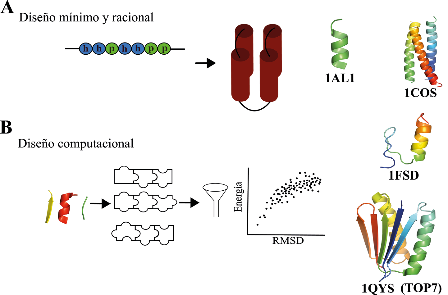 Figura 2. Estrategias de diseño de proteínas de novo. (A) Diseño mínimo y racional. Patrones de residuos hidrofóbicos (h) y polares (p) útiles para el diseño de α-hélices. Se muestran las estructuras depositadas en el PDB con los códigos 1AL1 y 1COS. (B) Diseño computacional. A partir de esta estrategia fue posible obtener proteínas funcionales (1FSD), así como emplear pequeños fragmentos de estructura secundaria que generan un gran número de modelos, los cuales se evalúan mediante el software Rosetta con base en su energía y su similitud estructural, a través de un valor denominado RMSD. Los diseños con mayor probabilidad de éxito muestran un gráfico Energía vs. RMSD con forma de embudo (Leaver-Fay, 2011). Este enfoque permitió desarrollar una gran cantidad de proteínas de novo, incluida TOP7, una proteína con un plegamiento jamás observado en la naturaleza.