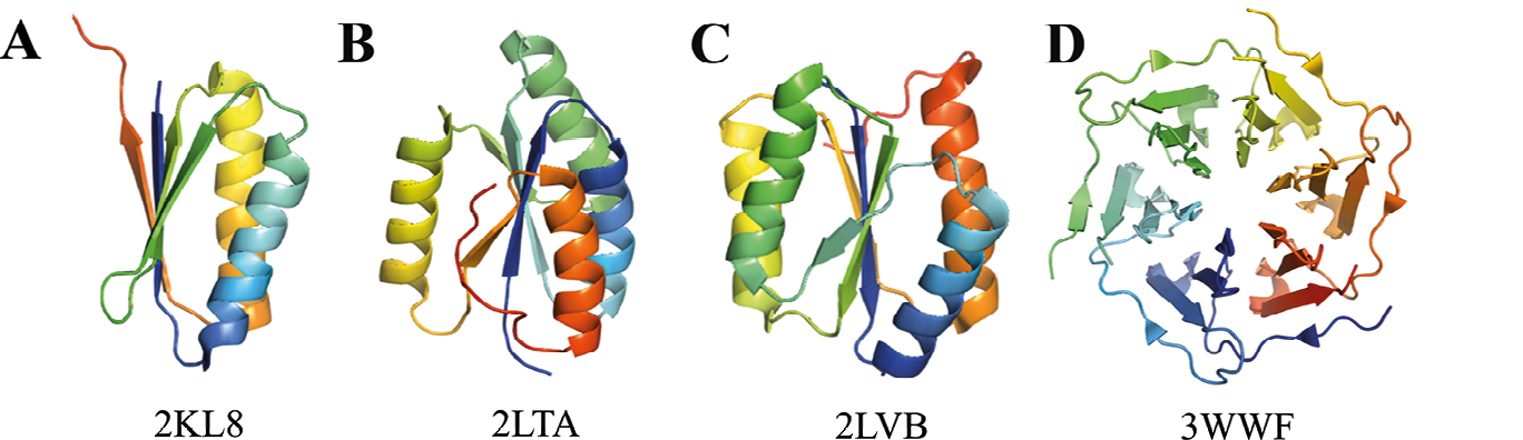 Figura 3. Proteínas de novo con plegamiento tipo αβ. Plegamiento tipo (A) ferredoxina, (B) bucle-P, (C) Rossman y (D) tipo pizza.
