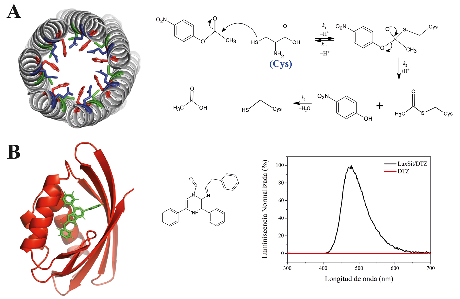 Figura 6. Enzimas diseñadas de novo. (A) Hidrolasa de acetato de p-nitrofenil, obtenida mediante la inserción de la tríada catalítica Cys-His-Glu (en colores) sobre un andamiaje de novo (en gris). Datos tomados de Burton et al. (2016). (B) Luciferasa diseñada de novo (LuxSit), que cataliza la quimioluminiscencia de difenilteracina (DTZ). Datos tomados de Yeh et al. (2023).