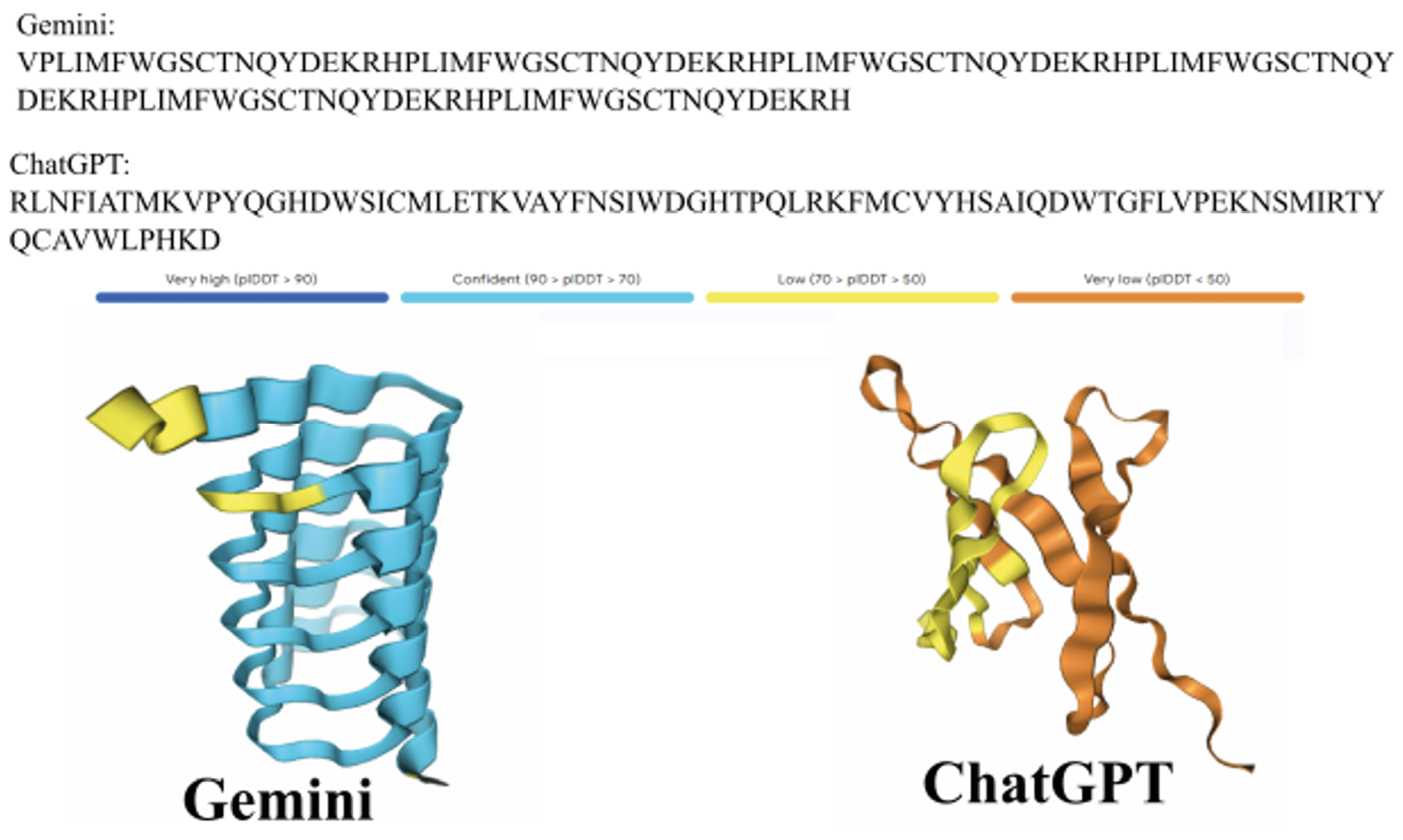 Figura 3. En la parte superior se muestran las secuencias aleatorias generadas por Gemini (Google, 2024) y ChatGPT (OpenAI, 2024), con sus estructuras predichas por AlphaFold3 (Abramson et al., 2024). En la parte media se indica la escala de confiabilidad de la predicción: el azul señala regiones que probablemente adoptarán la estructura mostrada, mientras que el naranja corresponde a regiones con baja confianza en la predicción.