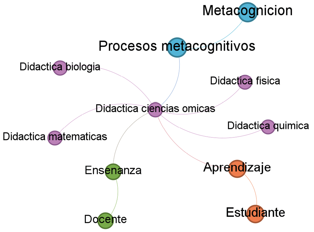 La didáctica de las ciencias ómicas es un concepto emergente en el campo educativo, que implica la integración de diversas disciplinas científicas y de sus respectivas didácticas específicas. Esta integración busca generar complementariedad en los procesos de enseñanza y aprendizaje, además de favorecer la transversalización del conocimiento científico en el aula universitaria. En la Figura 3 se ilustra una red conceptual que representa la interconexión entre diferentes dominios disciplinarios y procesos metacognitivos, todos ellos esenciales para la enseñanza de las ciencias ómicas. En este esquema se destaca cómo la didáctica de la biología, la química, la física y las matemáticas se vinculan con los procesos de enseñanza y aprendizaje, en un entorno donde la metacognición y los procesos metacognitivos actúan como ejes transversales de apoyo al aprendizaje autónomo y aprendizaje profundo.