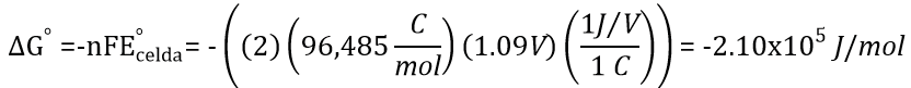, y para el cálculo de la energía libre de Gibbs se debe emplear la ecuación ΔGº = -nFEºcelda, con F, siendo la constante de Faraday es 96,485 C/mol.