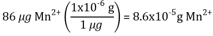 Se determina la masa, en gramos, de manganeso en un litro de agua sabiendo que se tienen 86 μg.