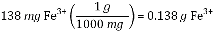 Se determina la masa, en gramos, de hierro en un litro de agua sabiendo que se tienen 138 mg.