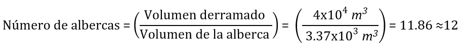 A partir del volumen que tiene una alberca es posible determinar la cantidad de albercas necesarias, considerando que el volumen derramado fue de 40 mil m3.