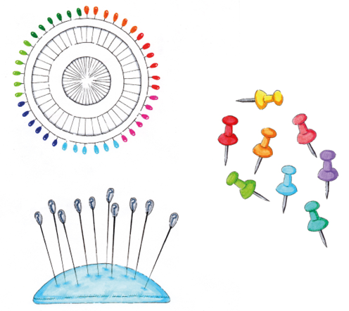 c. Alfileres de cabeza de plástico de varios colores (representarán las diferentes proteínas HA; ver figura 3)
