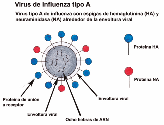 El material genético de los Influenzavirus A y B consiste en 8 cadenas o segmentos de ARN. En la envoltura del virus de la influenza se encuentran dos proteínas sumamente importantes: la hemaglutinina (HA), que se une a los receptores y le permite ingresar a las células y la neuraminidasa (NA), la cual permite la salida de los nuevos virus hacia el exterior de la célula. La identificación de las variedades de influenza se basa en estas dos proteínas; existen 16 tipos de HA y 9 tipos de NA. El virus de la influenza que ocasionó la pandemia en 2009 fue un Influenzavirus A que tenía la HA tipo 1 y la NA tipo 1, por eso se denominó influenza A H1N1.