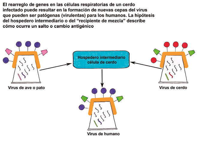 7. En este momento continuar orientando un debate sobre el salto antigénico y la evolución preguntando a los alumnos cómo la hipótesis del hospedero intermediario o recipiente de mezcla (célula del cerdo) puede explicar el salto antigénico.