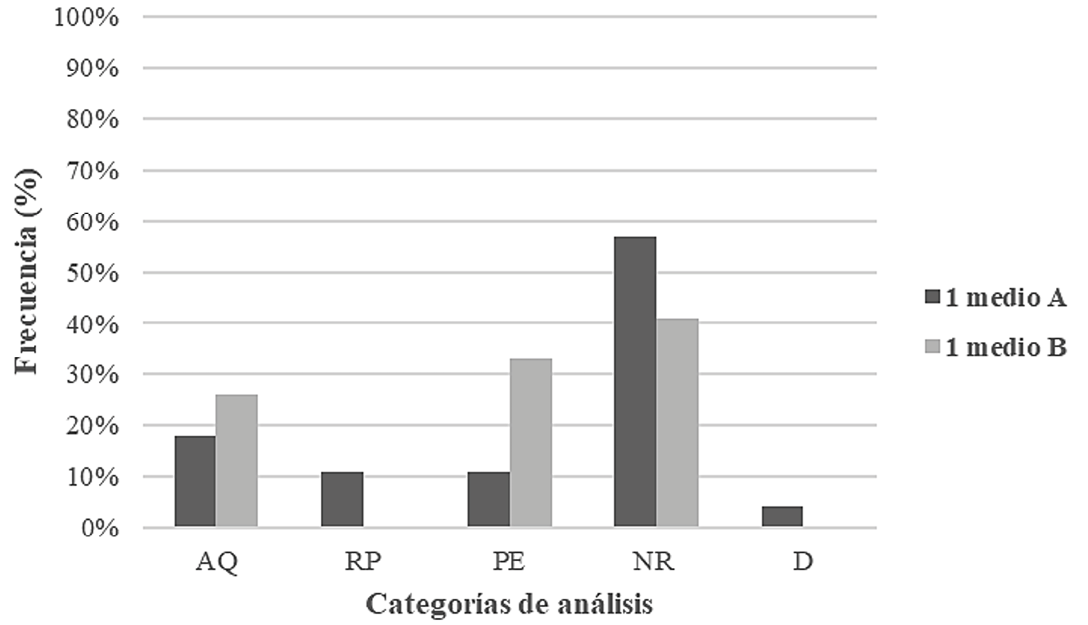 Gráfico 1. Narrativas estudiantiles sobre el ciclo salitrero según dimensiones temáticas. (AQ = asociación de aspectos químicos; RP = repite la pregunta; PE = parafraseo del enunciado; NR = no responde; D = duda).