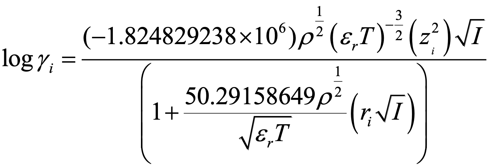 En donde T es la temperatura absoluta (K), ρ es la densidad de la disolución (g·cm-3), zi es la carga de los iones, ri es el radio iónico de solvatación de los iones (Å), I es la fuerza iónica de todos los iones presentes en la disolución (mol·L-1) y εr es la permeabilidad eléctrica relativa del medio acuoso. La ecuación (16) es válida para valores de fuerza iónica moderada, es decir I ≤ 0.1 mol·L-1 (Clark, D. M. et al., 1986; Aranguri-Llerena G. et al., 2024).