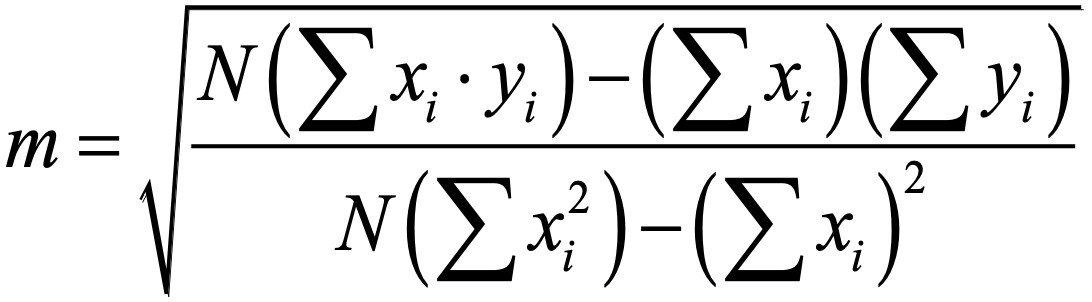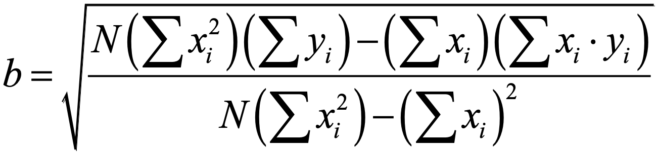 Con ayuda de la Eq. 22 es posible realizar un ajuste lineal aplicado al conjunto de los N pares de datos experimentales (xi, yi) de ln K vs 1/T, a través el método de los cuadrados mínimos (Miller, J. N. et al., 2005; GUM JCGM 100, 2008; VIM JCGM 200, 2012). Las ordenadas yi corresponden a ln K, en tanto que las abscisas xi a , de tal manera que la pendiente m será −Δhr0/R, mientras que la ordenada al origen b, será igual a Δsr0/R. Estos valores pueden calcularse respectivamente como (Miller, J. N. et al., 2005; Williams A., 1995):