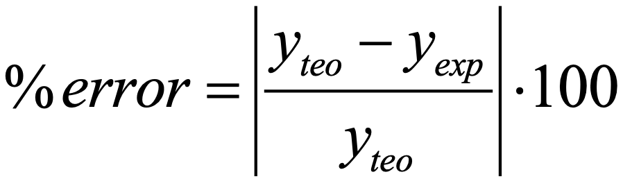 Para evaluar la calidad de las mediciones realizadas en este trabajo, se determinó la exactitud, calculando el % error, comparando el valor teórico yteo (Chang, 2008) y el valor experimental obtenido yexp de las propiedades termodinámicas Δhr0 y Δsr0, empleando la siguiente ecuación (GUM, 2008; VIM, 2012; Williams A., 1995):