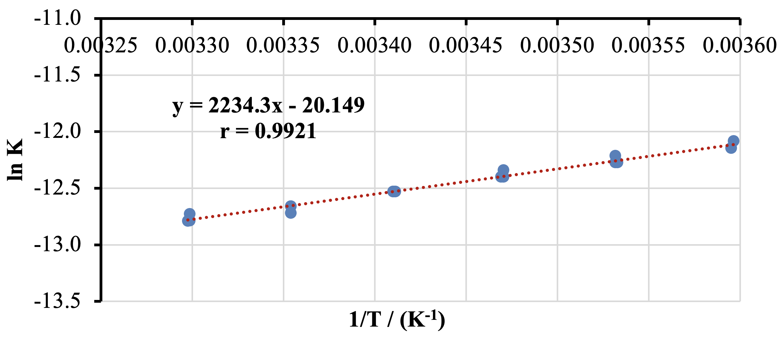 La gráfica de ln K vs 1/T muestra una tendencia lineal, continua, monotónica y creciente en el intervalo de 278.15 a 303.15 K, con un coeficiente de correlación de r = 0.9921, lo cual se confirma con el rechazo de la hipótesis nula H0: r = 0, en la prueba de linealidad.